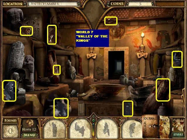 Curse of the Pharaoh consists of 53 levels in its main gameplay mode, plus 4 minigame levels. The main gameplay mode includes the three following types of levels: Spot the difference levels The player must find all 10 differences between the pictures on each side of the screen, additionally the player will collect and keep one such item in their inventory, to be used to solve a puzzle in that level, or some other level within the same world.