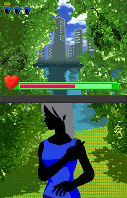 After a series of challenging minigames, the player finally got to hold the girl's hand (done by literally touching her hand, and moving your finger up and down with it to keep your hands connected), brush things off her back, button her dress, etc. Ultimately, as the story takes a dramatic turn, the player must fight grueling minigames against a the final boss. I personally got a pretty bad friction burn on my finger (which was more effective for this game than the stylus or thumb strap) against one of the forms of the final boss.