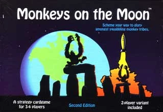 There are Monkeys on the Moon! These stranded primates have formed six tribes, each hoping to return to Earth. You have the space ships to get them back, but who do you send? Build favor with the tribes by helping them discover important civilization advances such as the ability to rollerskate or how to play badminton. Use the favors you've earned to bid on monkeys for the journey back to Earth. Assist the most advanced tribes and you may become Supreme Leader of all monkey-kind.