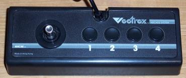 The Vectrex Controller was the standard controller for all Vectrex units. It consisted of an 8-directional joystick and four action buttons on a rectangular base. The Player 1 controller was hard-wired to the unit, while the Player 2 controller was detachable.